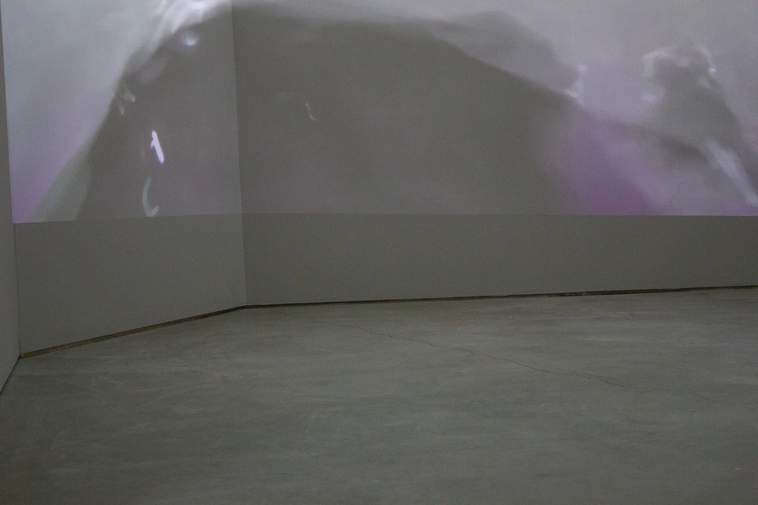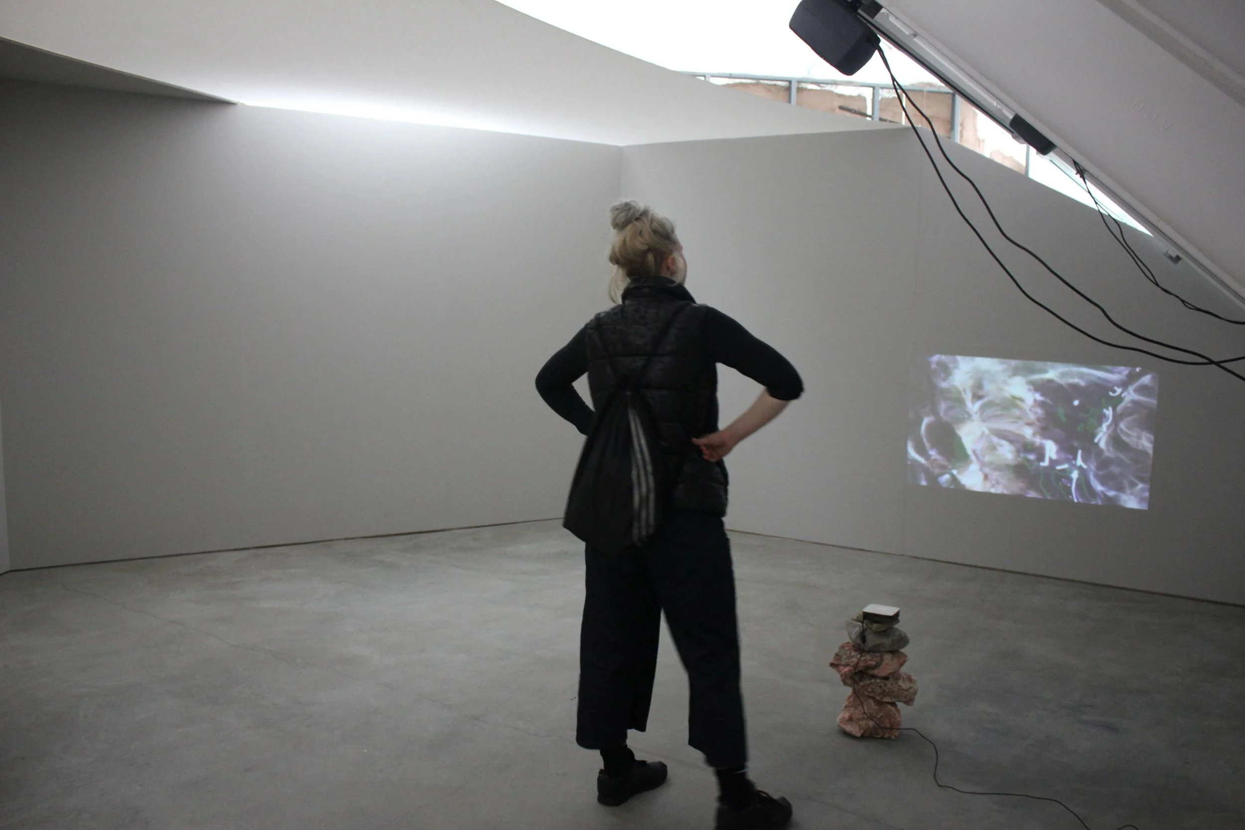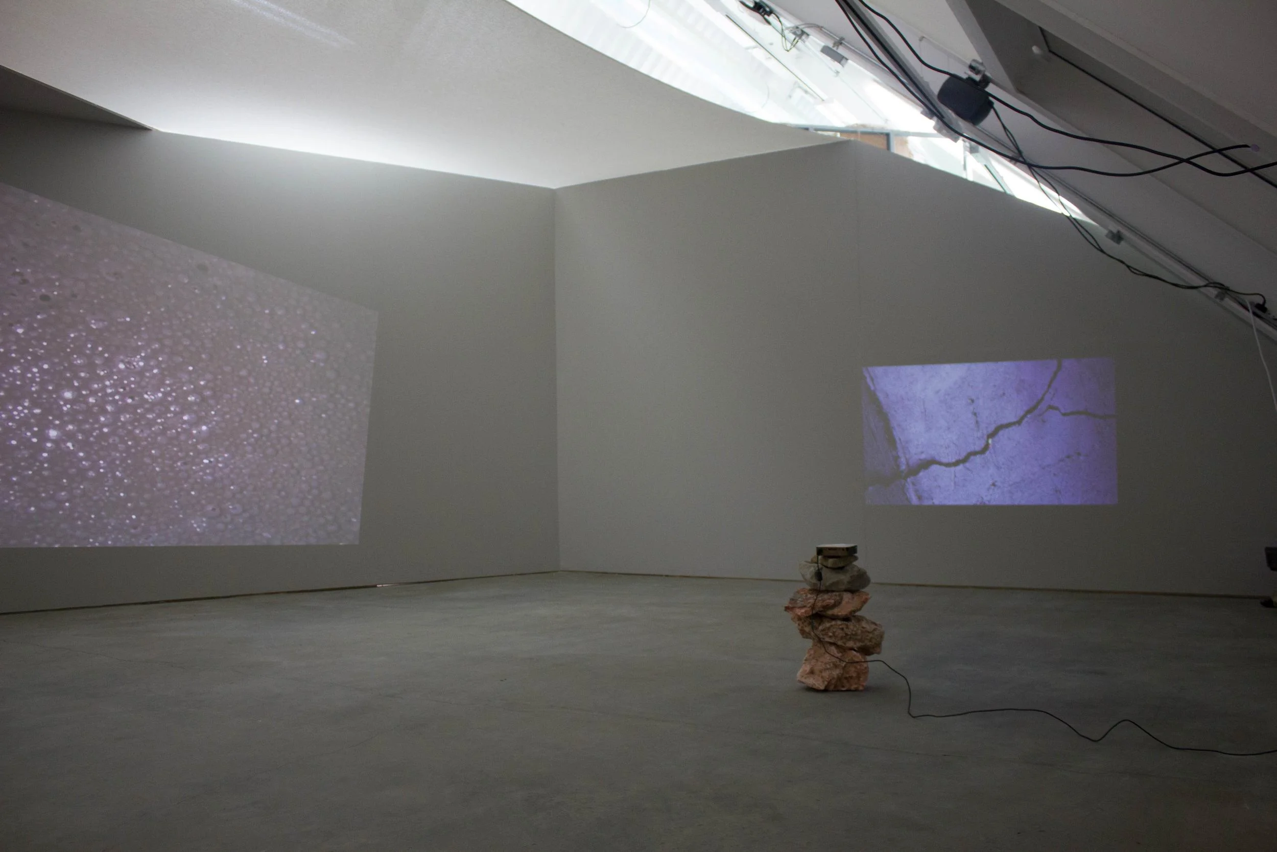 Videos: Ablation 6.00 mins, Chamber 12.34 mins, Projector on large rock from Thames foreshore, Mini projector on rocks from Penarth, Wales. Speakers, washed floor, muslim, wood.