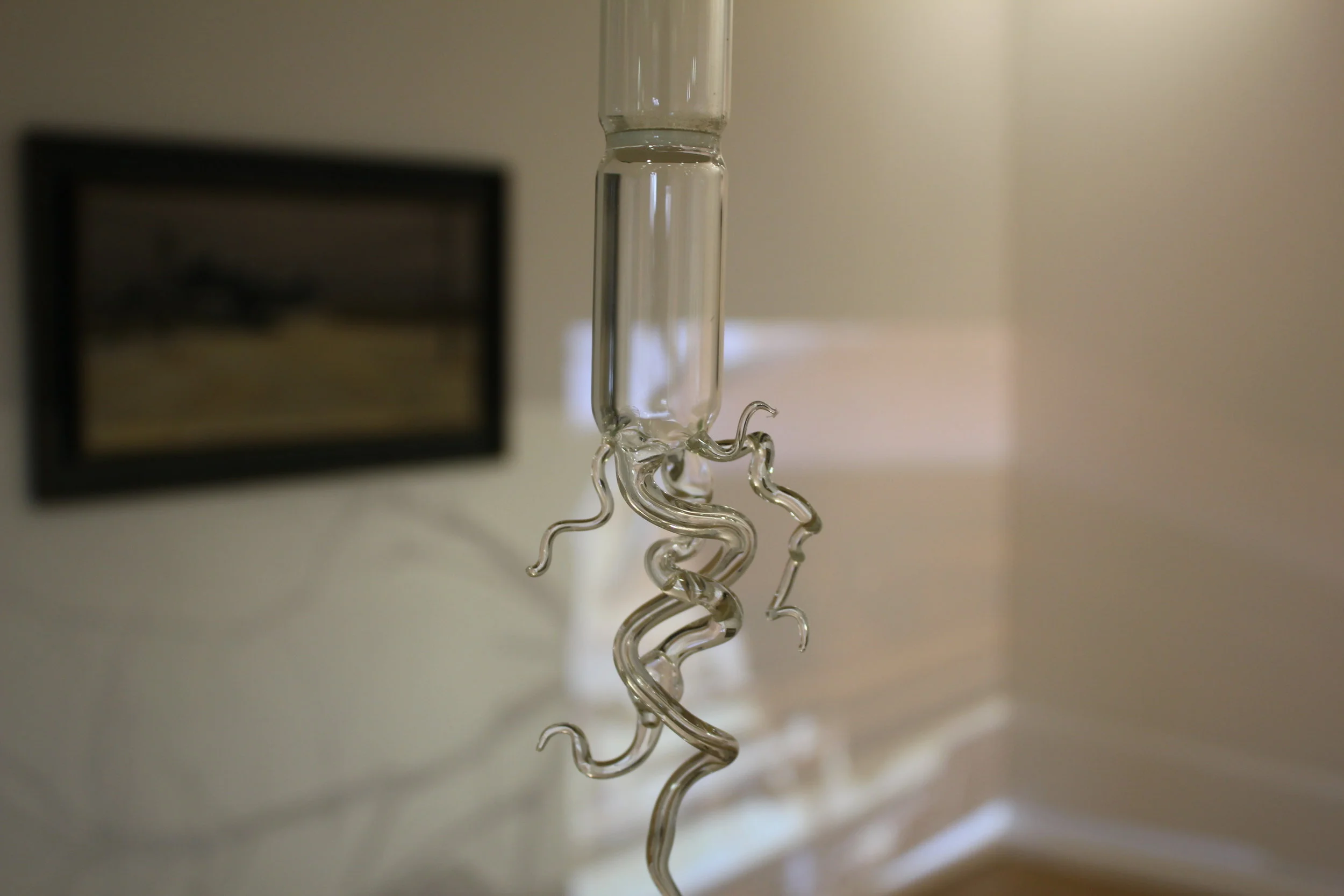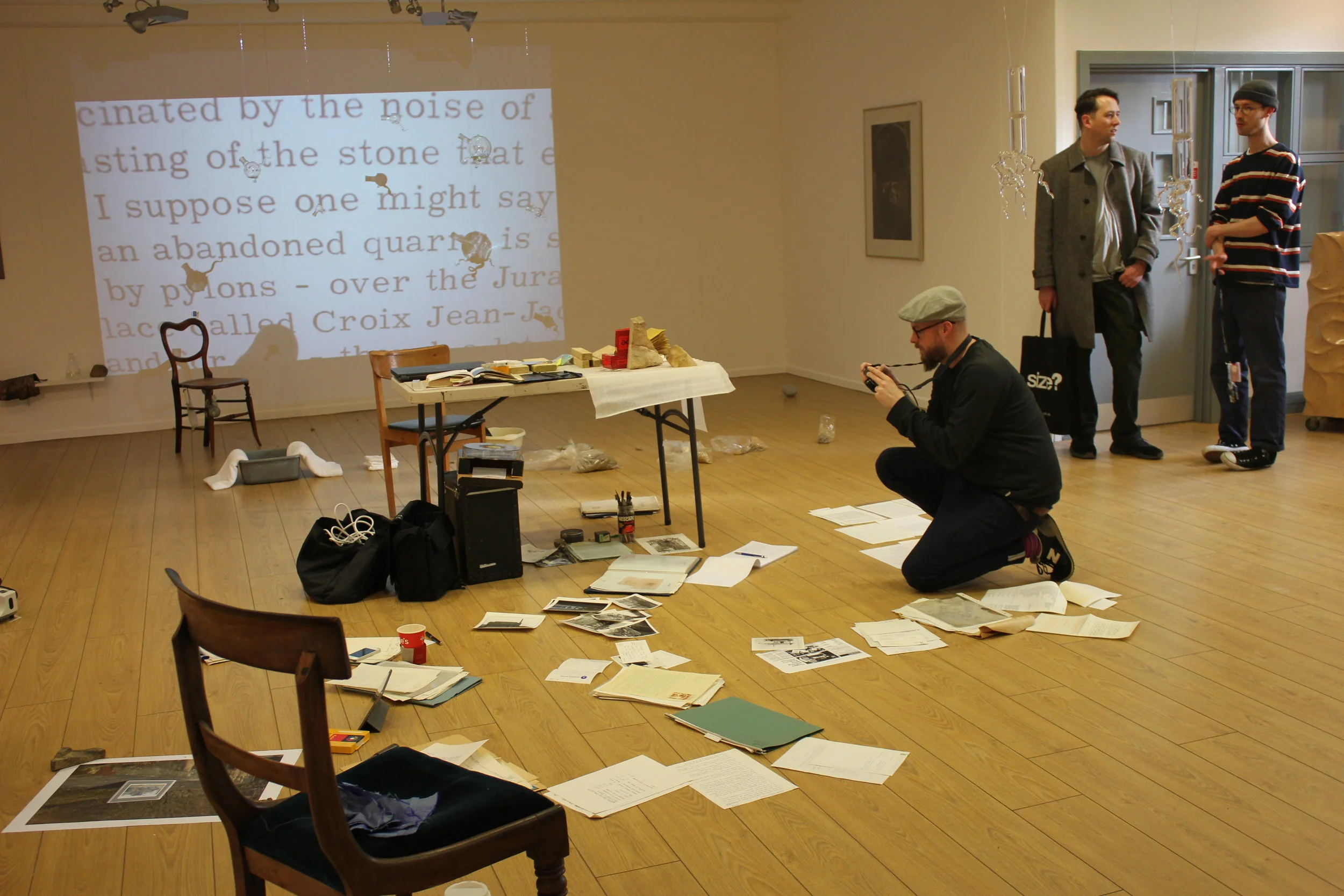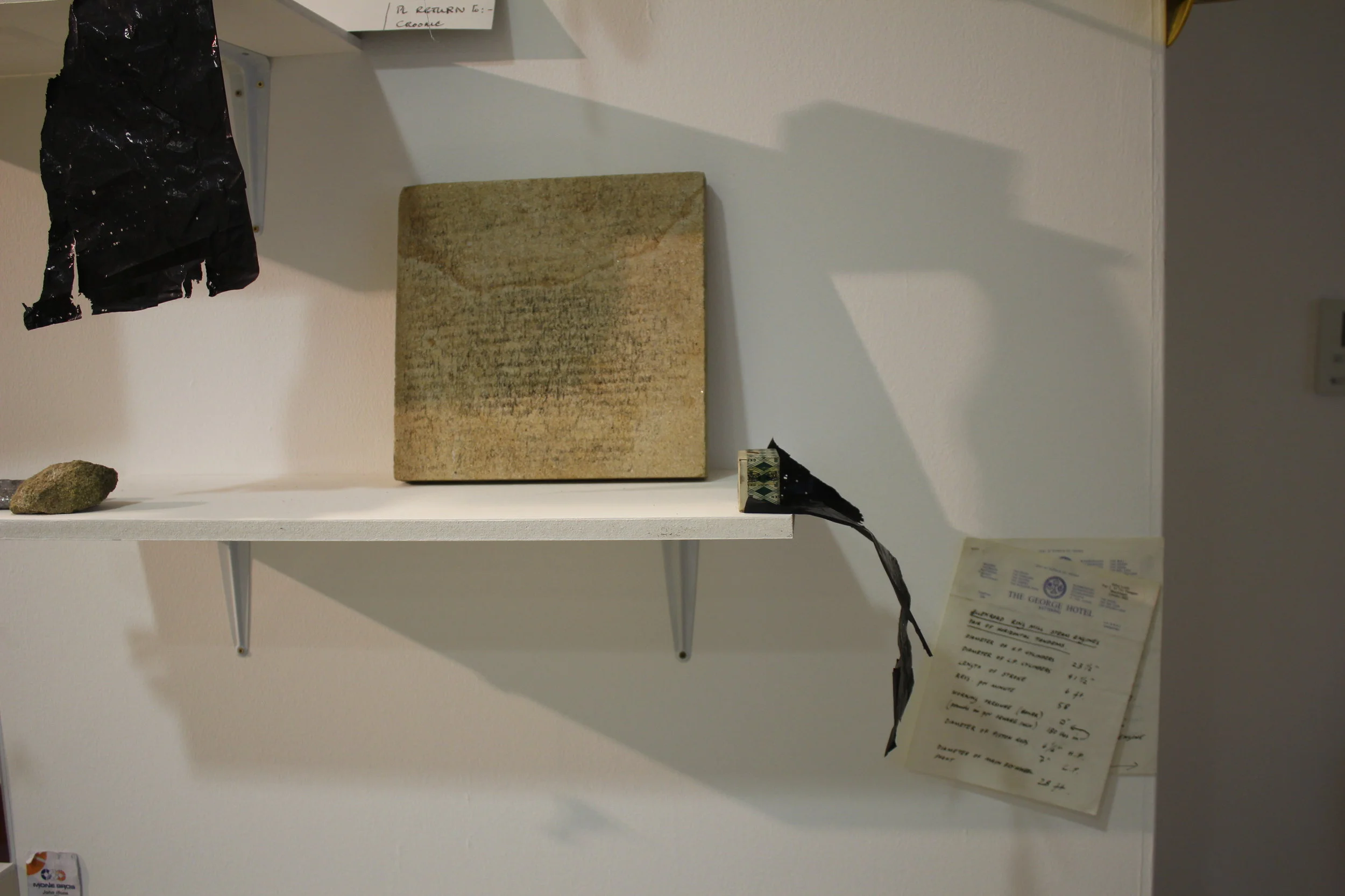 “Habitual disorientation leads me uncertainly to Leeds Art Gallery, but when I glimpse a chair, heap of rocks, and things, giving an visceral sense of stuff happening I know I have found Aggregate: Fritha Jenkins & Edna Lumb. Entering the space, which sits somewhere between the domestic and the studio, you are immediately part of that happening; and you feel compelled to immerse yourself in the objects around - letters are heaped tantalising in piles on a shelf, images lie next to one other, bits of text float or are stuck on the floor. Everywhere are rocks, stones, loved detritus and tools of work, books sheaved with notes, peculiarly shaped glass vessels, awkward pillows of dank water; all placed with an openness that allows a 2 year old to pick up the rocks and investigate/consider. It all suggests an ongoing and working relationship with all the material, one that is thoughtful and loved, entirely lacking in artfulness or pretension of any sort.