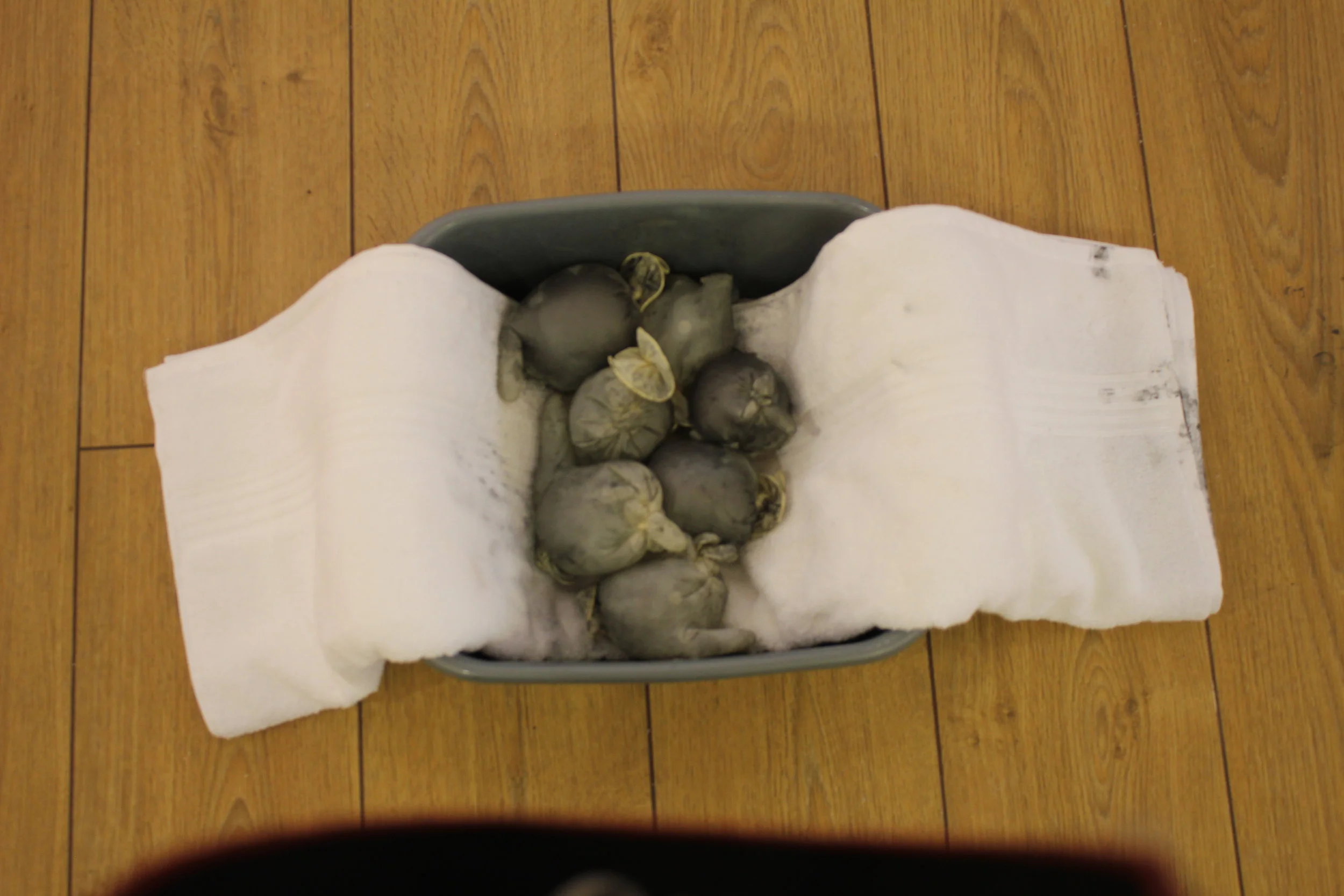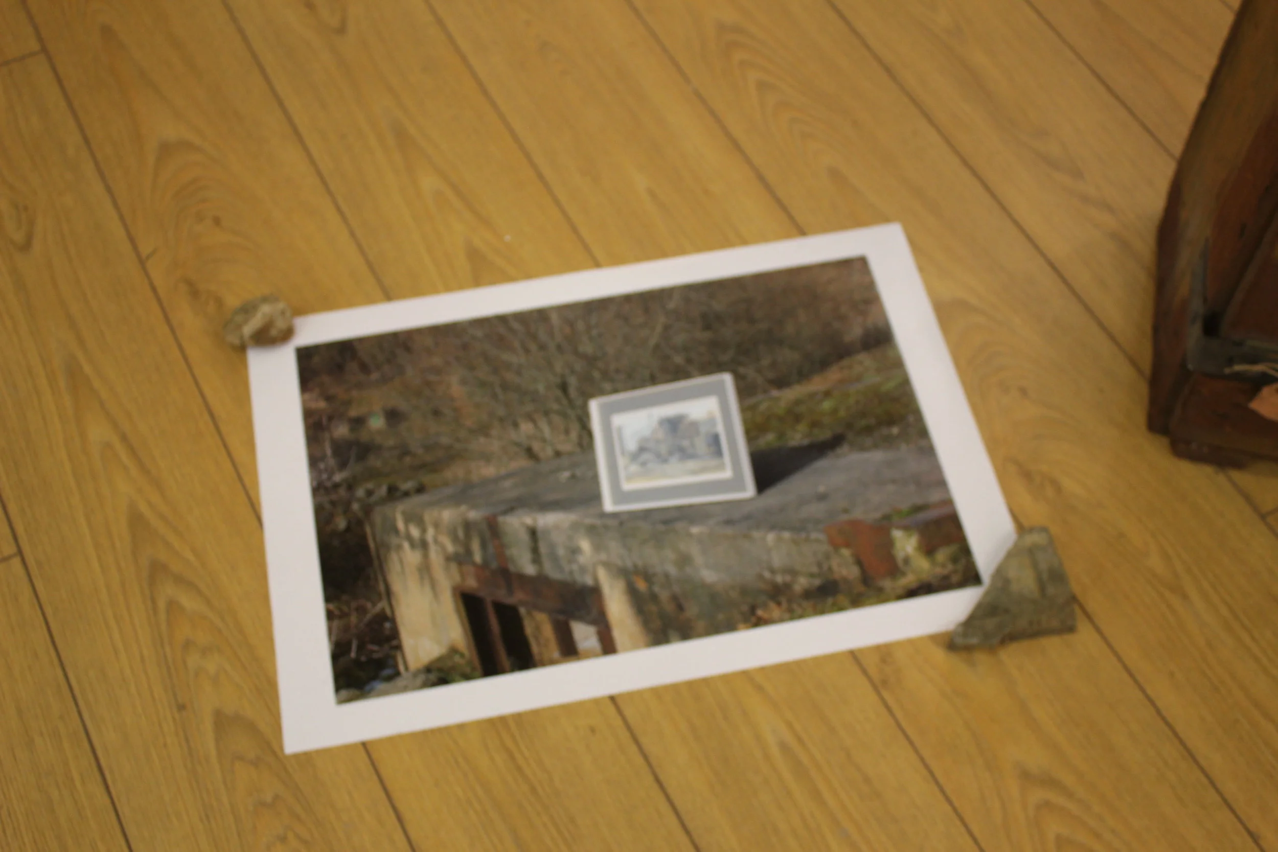 All images are moments photographed across the run of Aggregate. Alongside Edna Lumb paintings and archive, other materials brought into the space included; Thames river water collected from under London bridges, glittery rocks from the abandoned quarry (where Edna painted 'Abandoned Quarry), mud from the curator and Fritha Jenkins' boots collected during performances and site visits. Stone from a working quarry (where Edna painted), surgical gloves filled with bath water after the artist bathed, Thames foreshore stones, video footage of Fritha Jenkins and flatmate dancing in the kitchen.