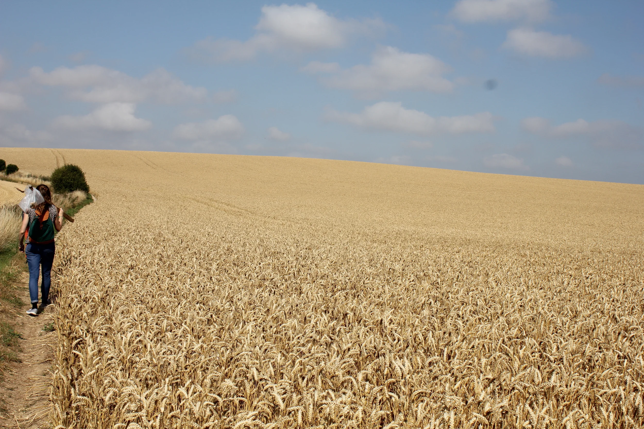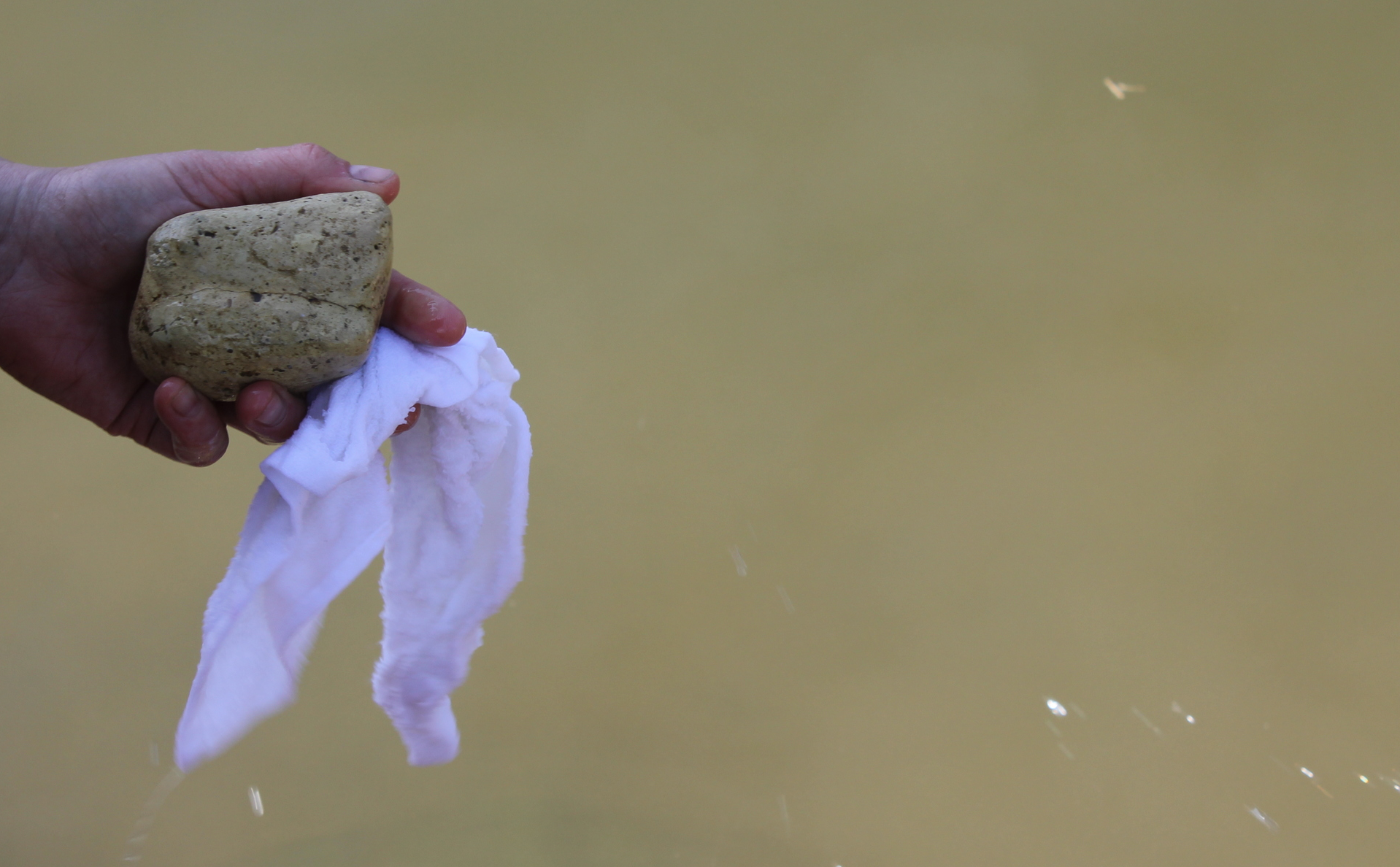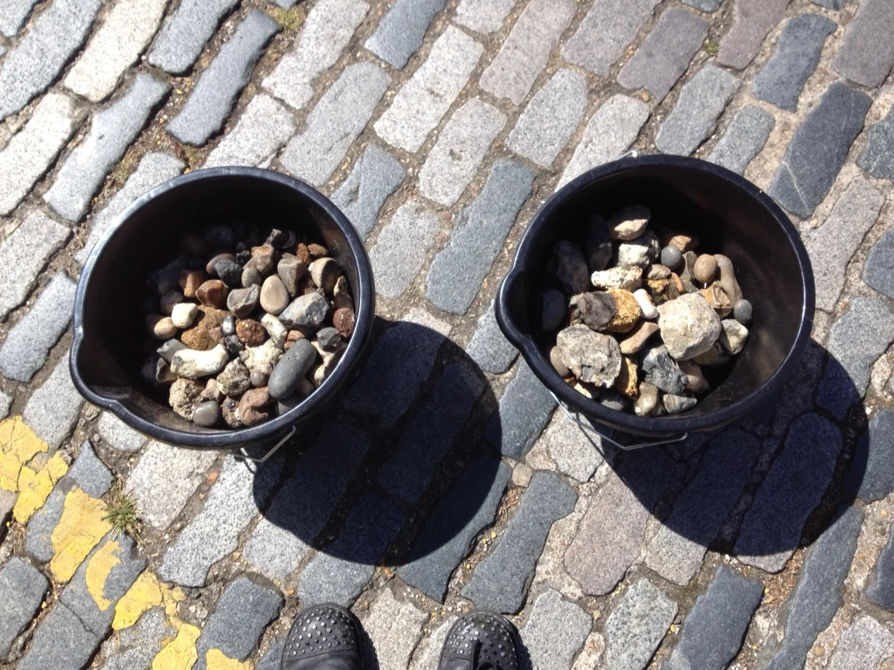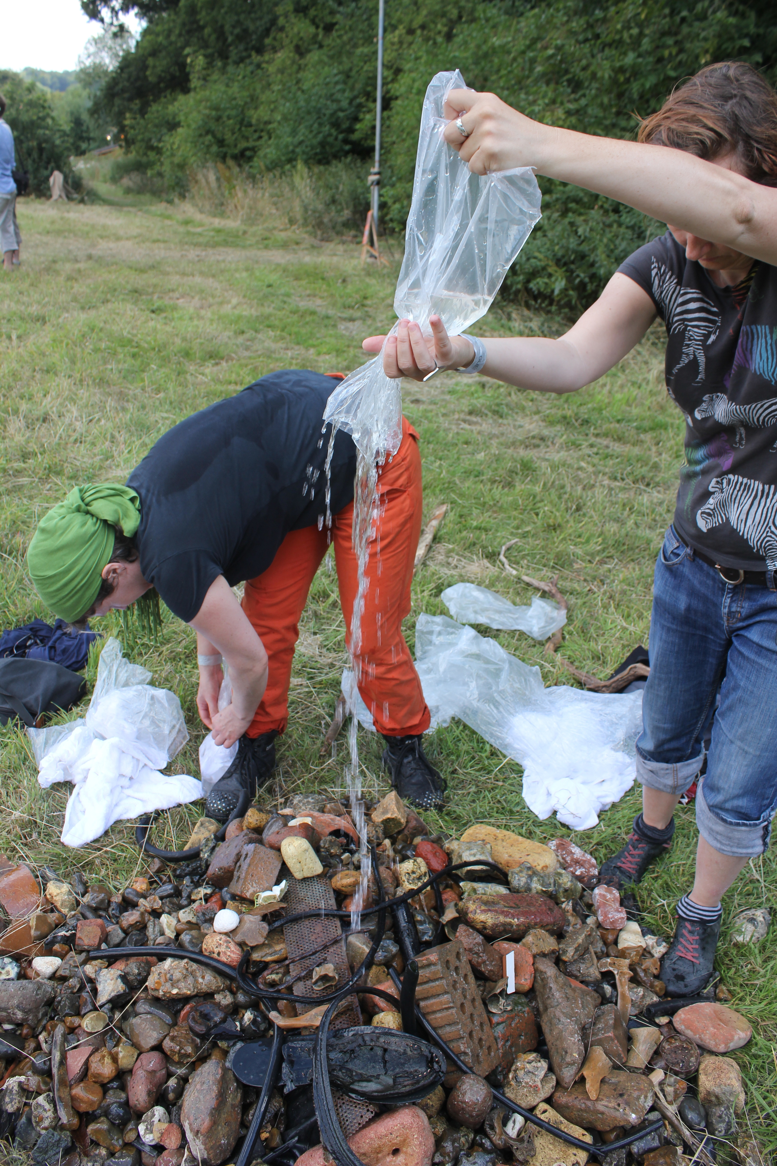 Foreshore was collected from the Thames at Greenwich, London between the tides - the quantity taken was determined by what the artist could carry. The foreshore was then shipped to Braziers Park in Oxfordshire where it was deposited in a field. On Saturday morning the public were invited to pick some pieces of foreshore from the pile and join the artist on a 2.5mile silent walk across the fields to the Thames. Once there the walkers washed the downstream foreshore in the upstream Thames before collecting bags of water and heading back across the fields. Back at the site they performed a fountain over the remaining London foreshore pieces with the Oxfordshire Thames water.