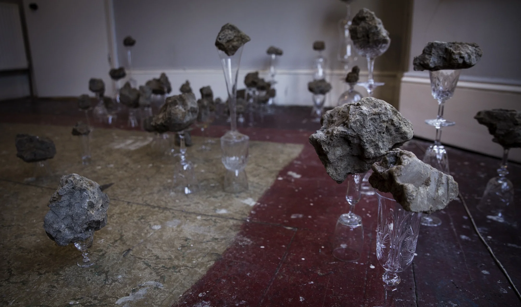 “Fritha Jenkin’s work Reception looking like a meteorite storm frozen in free fall turns the living room into a site of physical negotiation with hundreds of carefully balanced glasses topped with lumps of clay dug from the basement foundations of the house. ”