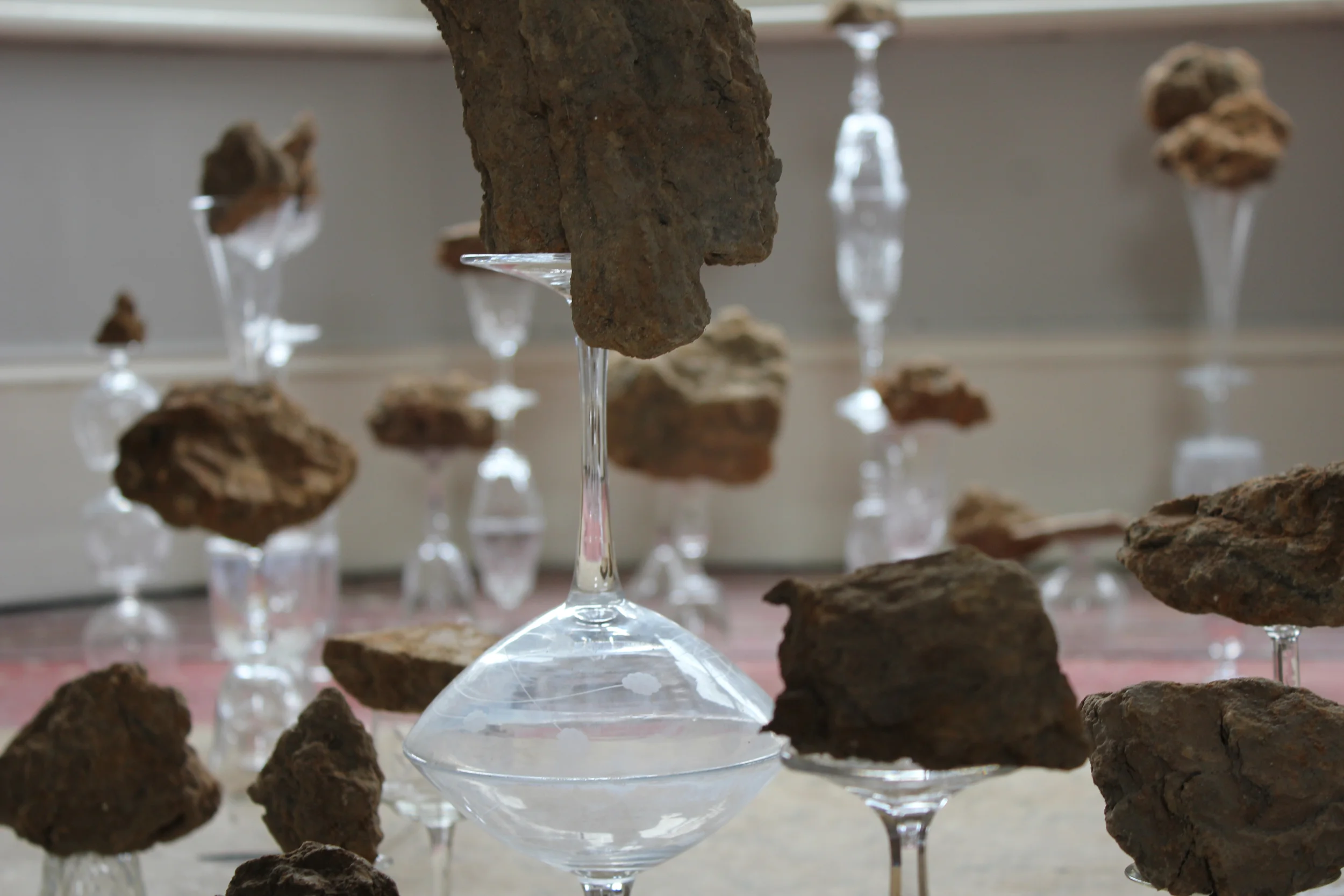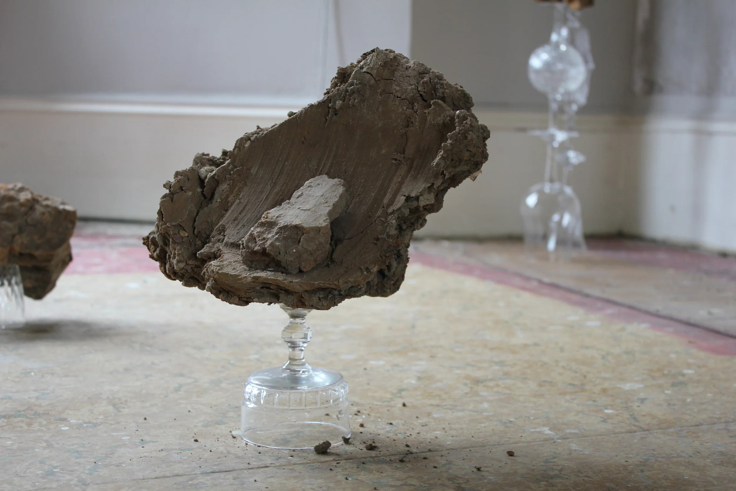 “Fritha Jenkin’s work Reception inhabits the living room where hundreds of upturned glasses balance clay dug up from the foundations unseen basement of the house. Confronted with a powerful yet unnerving landscape the absurd use of materials creates a strong sense of tension. Reception transports you into an intimate alien like world.”
